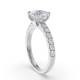 The cushion diamond blends rounded corners with facets in this shoulder-set engagement ring. Its pillow-like shape offers a softer alternative to angular cuts whilst the accent stones add sparkle along the band. The setting secures the stone firmly and the band sits comfortably for everyday wear. This design bridges traditional and modern styles without leaning too heavily either way.