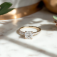 The cushion diamond blends rounded corners with facets in this shoulder-set engagement ring. Its pillow-like shape offers a softer alternative to angular cuts whilst the accent stones add sparkle along the band. The setting secures the stone firmly and the band sits comfortably for everyday wear. This design bridges traditional and modern styles without leaning too heavily either way.
