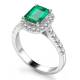 Smaller diamonds border the rectangular emerald centre stone in this halo design. The frame contrasts the step-cut facets with brilliant sparkle around the edge. The setting holds all stones firmly and the band provides a clean base. It's a way to add brilliance to a cut known for understated elegance. This style works for those who want the emerald's sophistication with added presence. Explore all of our engagement rings.